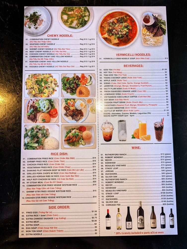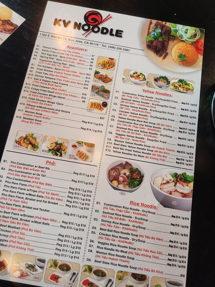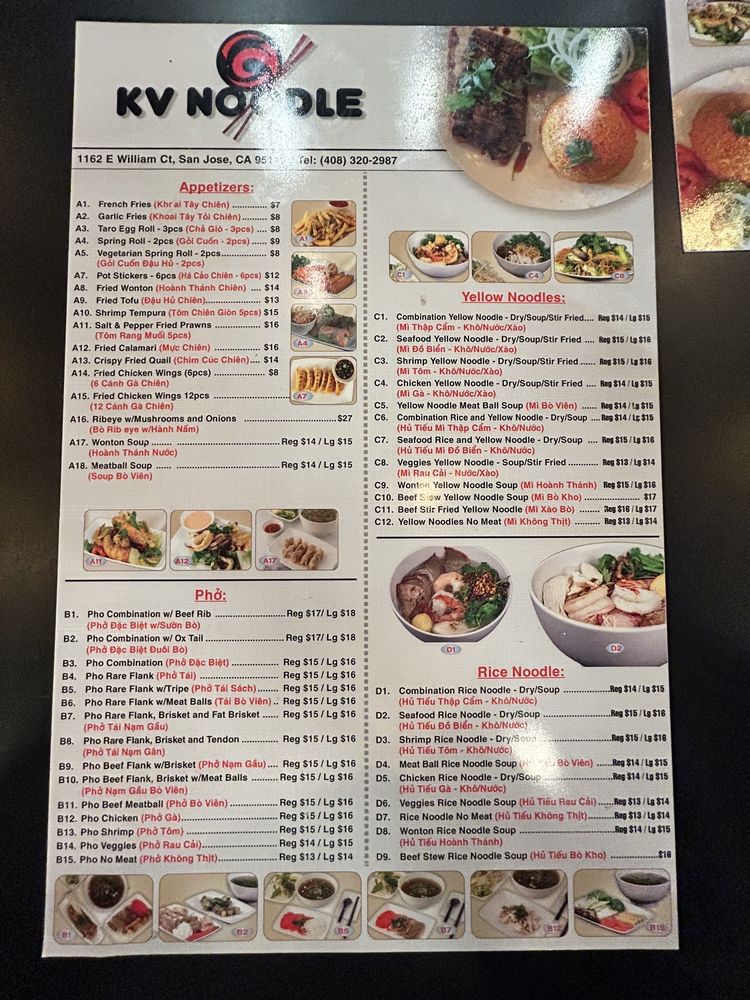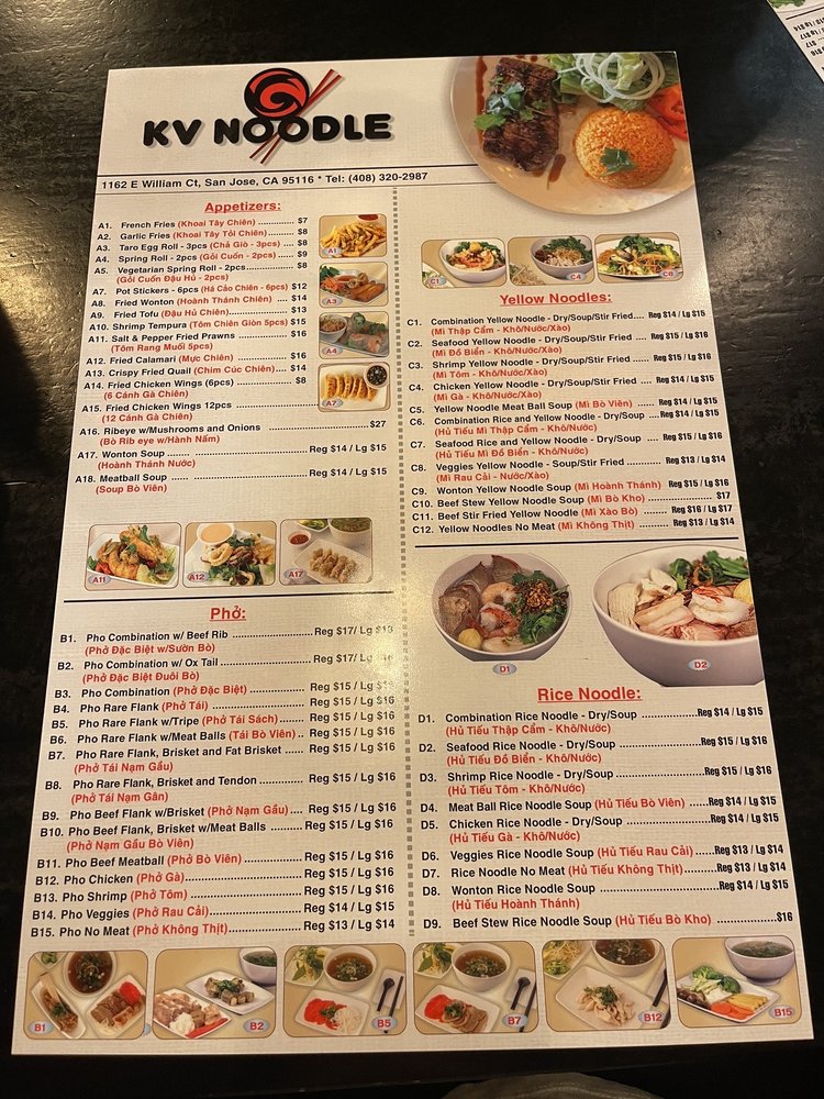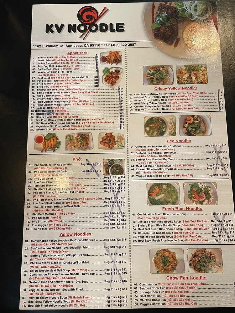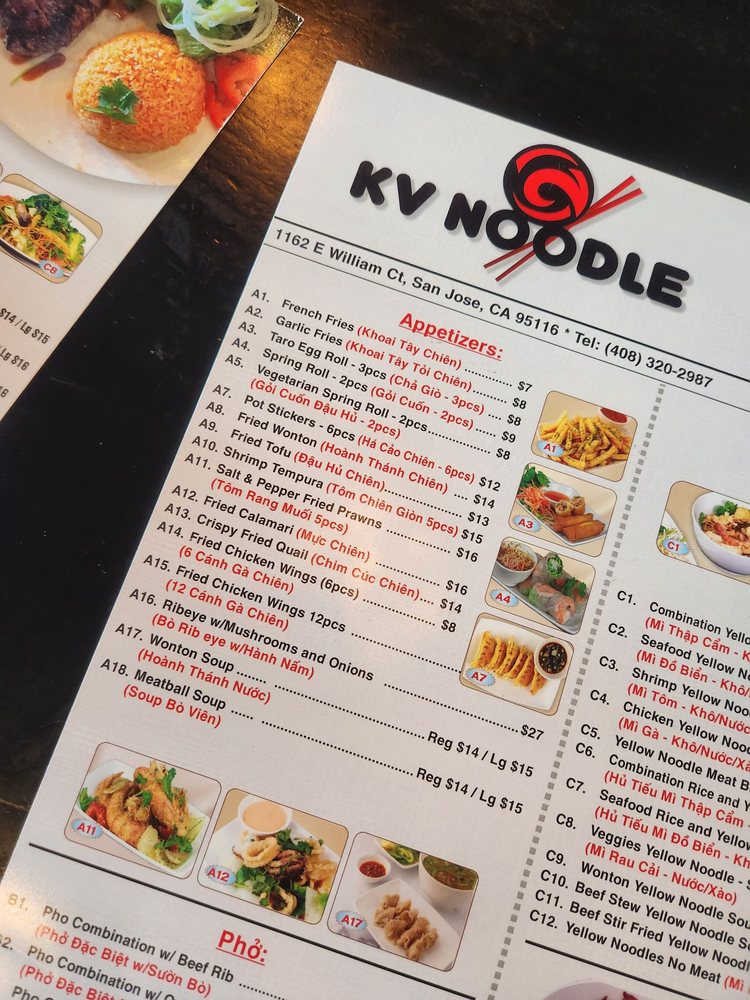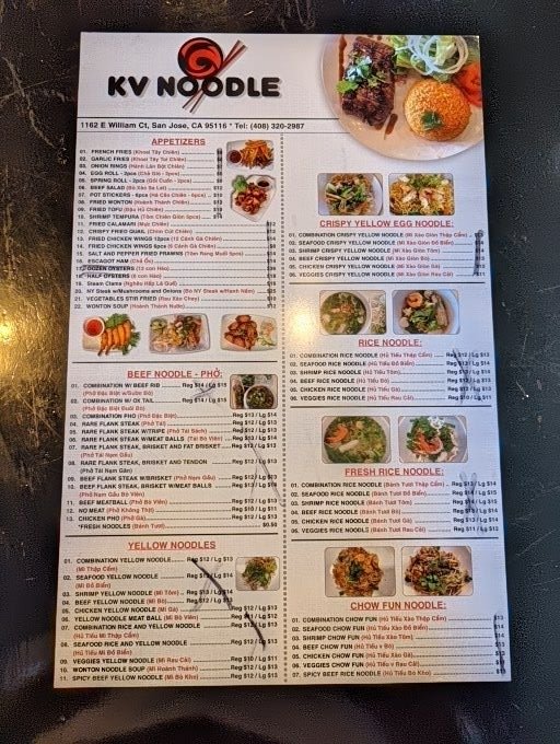 KV Noodle brings Vietnamese-inspired flavors to San Jose with a diverse menu featuring noodles, chicken wings, and more. This trendy and casual restaurant offers a plethora of options suitable for all preferences, including many vegetarian choices. From appetizers like garlic fries and fried calamari to signature dishes like brisket pho and combination yellow noodles, each dish is crafted with care and attention to detail. Customers rave about the flavorful broth, fresh ingredients, and generous portion sizes. The modern ambiance, friendly service, and extensive menu make KV Noodle a go-to spot for delicious Vietnamese cuisine. Don't miss out on the opportunity to try the standout dishes and experience the welcoming atmosphere at KV Noodle.
